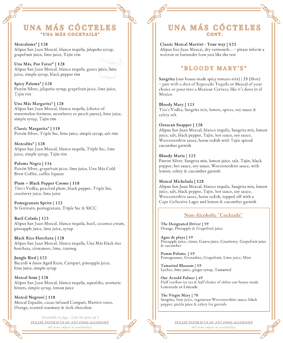 Welcome to Una Mas - Mezcaleria, a vibrant oasis nestled in the heart of Sea Point, Cape Town. This charming Mexican restaurant celebrates authentic cuisine with a contemporary twist. From their housemade crispy tortillas paired with zesty mezcal red chili salsa to refreshing salads like the charred gem lettuce topped with pomegranate and avocado mousse, every dish is crafted to tantalize your taste buds.